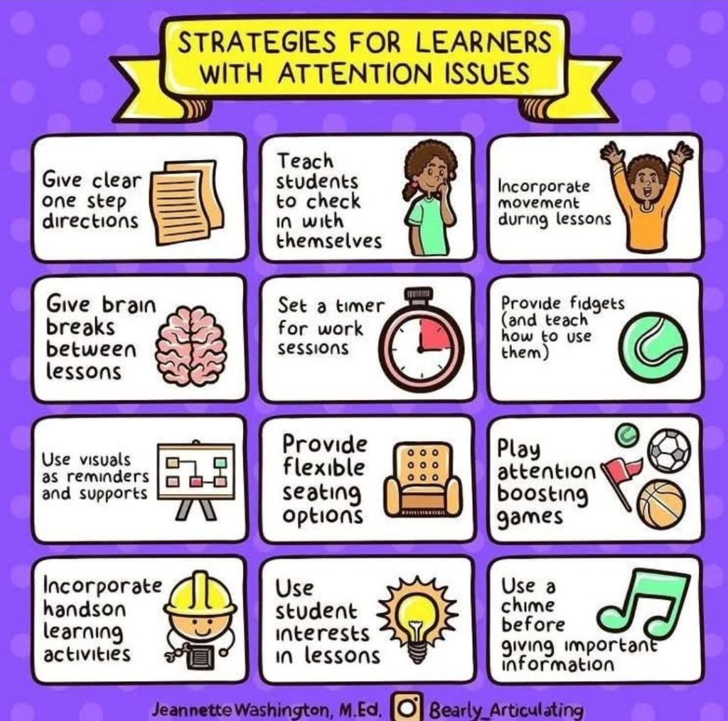 Use movement activities or fidget tools to re-engage attention (not all fidget toys are effective).